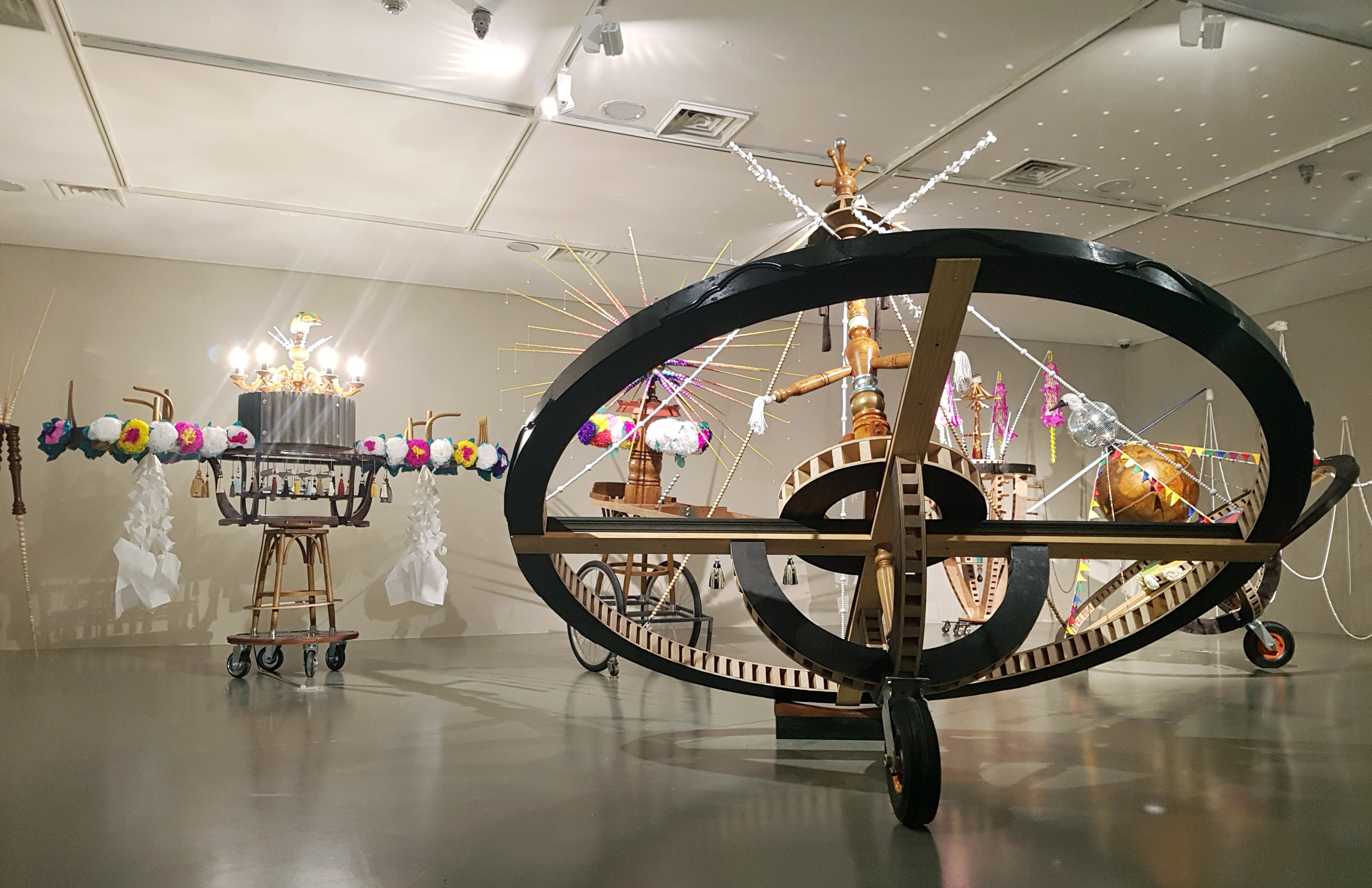 In Overlapped Sensibility: Carousel (2015), the birds reappear as ceramic bird heads resting atop wooden plinths of different shapes and sizes. The collection of figures is perched within a white motorised carousel, in reference to writer Haruki Murakami's description of the carousel as a metaphor for the fixed cycles of life, on which humans are trapped until death.
