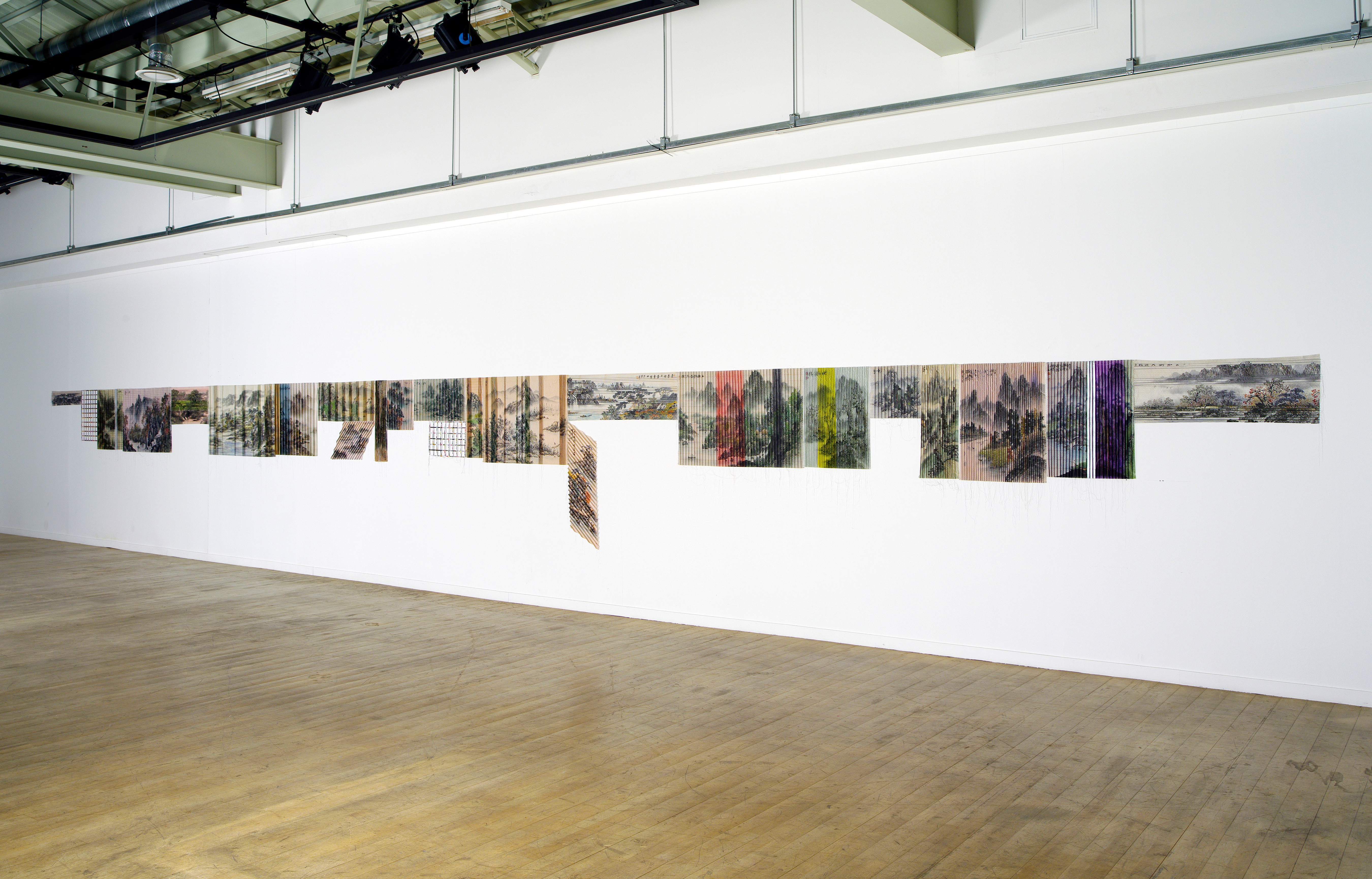 For Drift_Exercise for variability (2020), Min has gathered discarded landscape paintings, folded and sewn them, and layered grids on top,